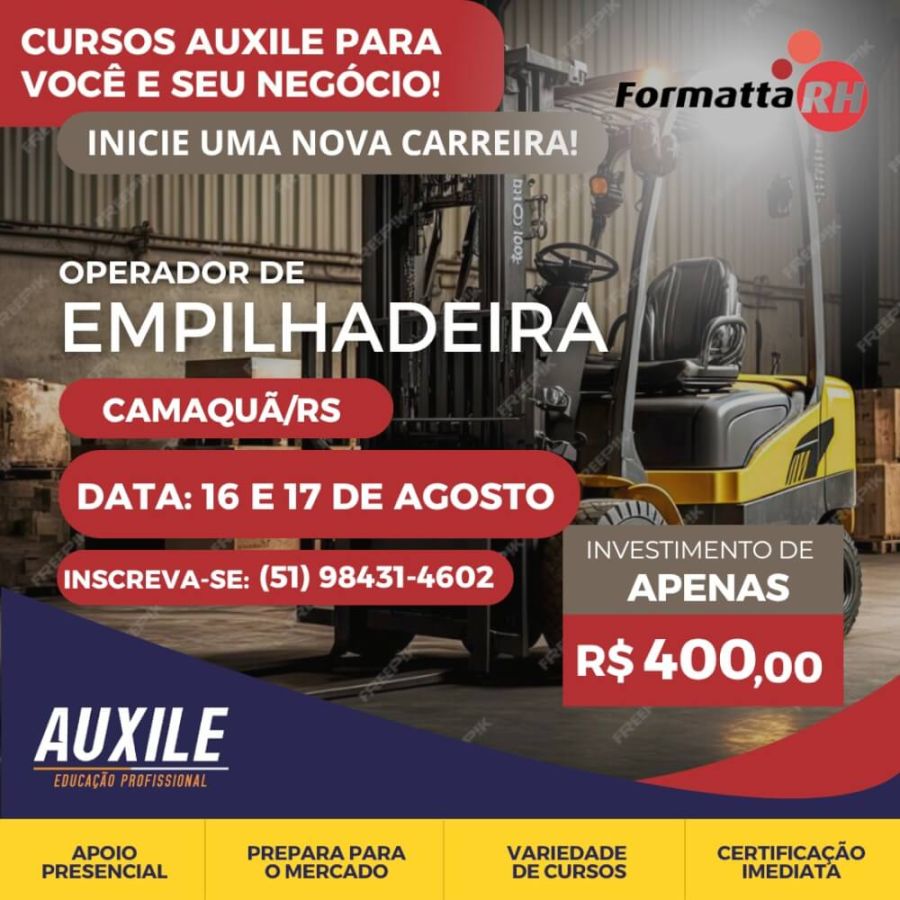 Para uma vaga de Operador de Empilhadeira é necessário fazer um curso que ensina a dirigir o equipamento com segurança, com no mínimo 16 horas de duração. É neste ponto que a Formatta RH em parceria com a Escola Auxile traz para Camaquã e região o curso de Operador de Empilhadeira, de 16 horas.